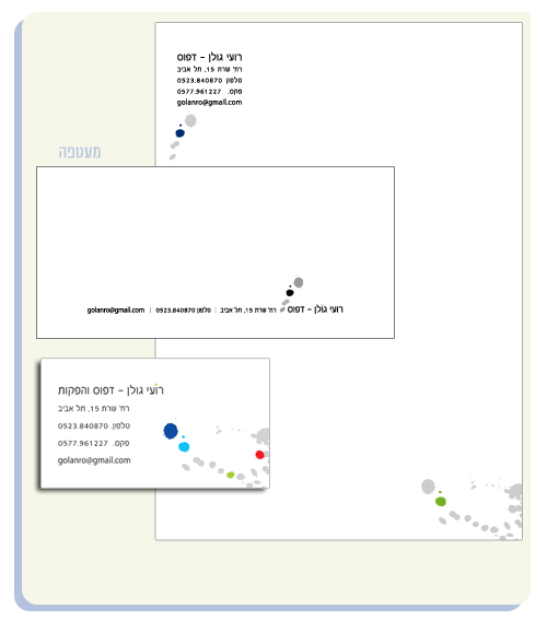לקוח: מאיה אילוז בל - הנחיית קבוצות ייעוץ שיווקי משתמשי אקס ליבריס - ישראל זיו עדאקי עורכת ומגיהה אבלין קלוגר קדיש נטפיש נטפיש פורום ישראלי לאנרגיה bar solutions אלה רוזנר - סופרן בלמיה - אנסמבל מוסיקלי מגמה ירוקה רקפת דפני מן - טיפול בעזרת בעלי חיים רחלי תדהר - ייעוץ אסטרטגי אורות - עיצוב המרחב מיכל שרים-שחם אדריכלות ועיצוב בית ספר לאומנויות - לימור רוז מבוי סתום ערבסקה - קונספט פירחוני ערבסקה - קונספט פירחוני רועי גולן מיני דפוס שניידר יחסי ציבור Magic touch - productions company with a twist Magic touch - productions company with a twist